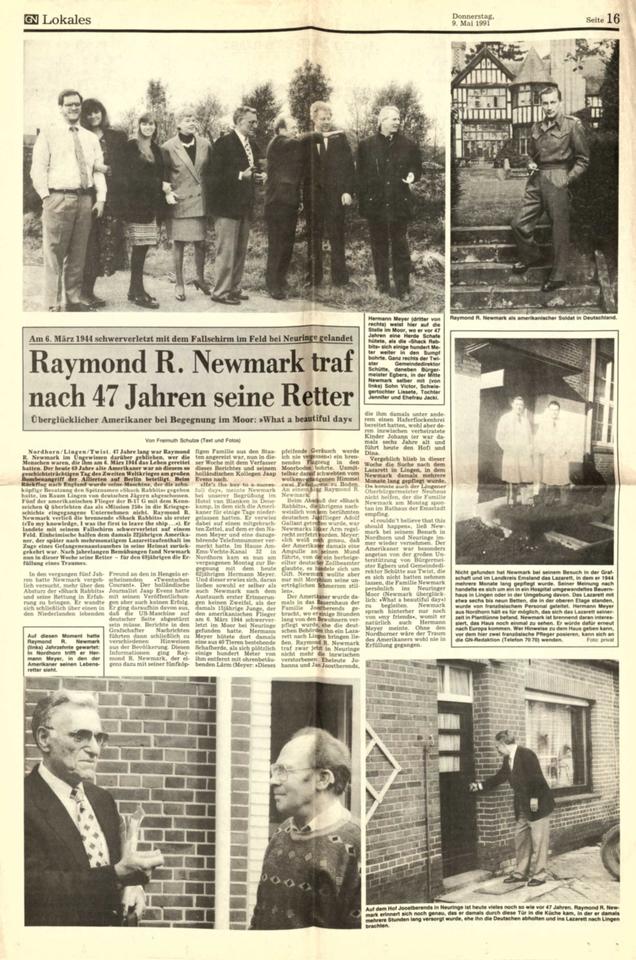 Mein Vater Hermann Meyer lebte auf einem Bauernhof bei Neuringe, Twist. Am 6. April 1944 hütete er Schafe, als er plötzlich ein pfeifendes, ohrenbetäubendes Geräusch hörte: Einige hundert Meter von ihm entfernt bohrte sich ein brennendes Flugzeug in den Moorboden. Es war eine amerikanische Maschine, die sich auf dem Rückflug vom Bombenangriff der Alliierten auf Berlin befand und von deutschen Jagdfliegern getroffen worden war. Von der siebenköpfigen Mannschaft konnten sich zwei Insassen per Fallschirm retten. Einer davon war Raymond R. Newmark. Mein Vater fand den Amerikaner und half, den Schwerverletzten in ein benachbartes Bauernhaus zu bringen. Dort wurde er für einige Stunden von den Bewohnern verpflegt bevor er in ein Lazarett nach Lingen transportiert wurde. Monate später kam er im Zuge eines Gefangenenaustausches frei.