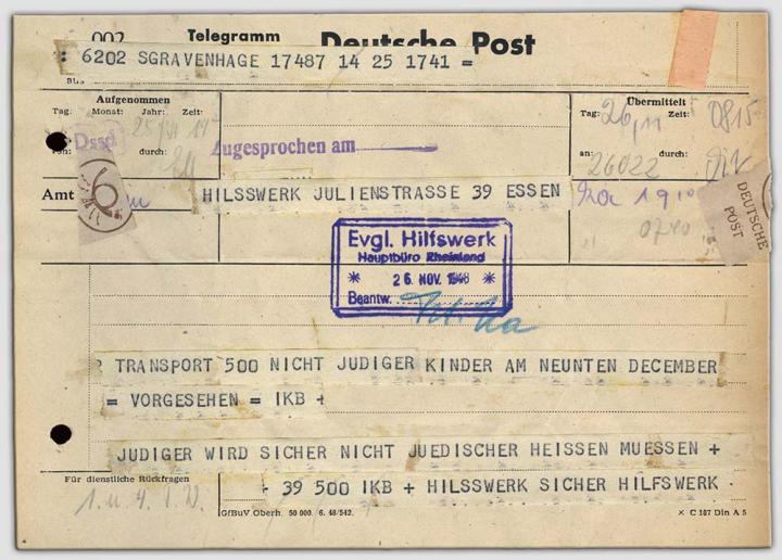 Bereits am 9. Dezember 1948 rollte der erste Transport mit 200 Kindern aus dem Rheinland und 300 Kindern aus Westfalen in die Niederlande. Eine Woche später reisten 53 evangelisch getaufte Kinder aus jüdischen Familien separat an. Die Benennung dieser Kinder erfolgte nicht über das Hilfswerk, sondern über Kontaktpersonen der International Hebrew Christian Alliance sowie der Vereinigung der durch die Nürnberger Gesetze Betroffenen e. V. Mitte März 1949 traten beide Gruppen die Heimreise an. Nach zeitgenössischen Presseberichten („Pausbäckig zurückgekehrt“) war der Packwagen dieses Sonderzuges mit 1.600 Geschenkpaketen der niederländischen Gastgeber gefüllt. Drei weitere Transporte schlossen sich bis zur Einstellung des Programms Anfang 1950 an. 1.760 Kinder aus Nordrhein-Westfalen konnten so für drei Monate der größten Not entrinnen und -physisch wie psychisch- neue Kraft sammeln. Insgesamt nahmen die Niederlande damals 69.000 (!) Kinder aus allen Regionen Deutschlands, aber auch aus Österreich, Ungarn und Frankreich auf.